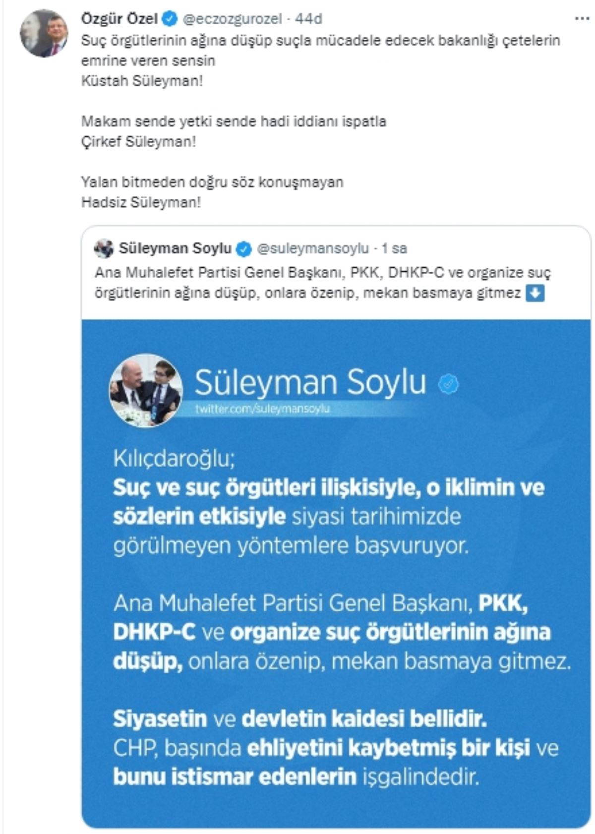 Özgür Özel, Twitter üzerinden Soylu'nun attığı tweet'i alıntılayarak "Suç örgütlerinin ağına düşüp suçla mücadele edecek bakanlığı çetelerin emrine veren sensin Küstah Süleyman! Makam sende yetki sende hadi iddianı ispatla Çirkef Süleyman! Yalan bitmeden doğru söz konuşmayan. Hadsiz Süleyman!" mesajını paylaştı.