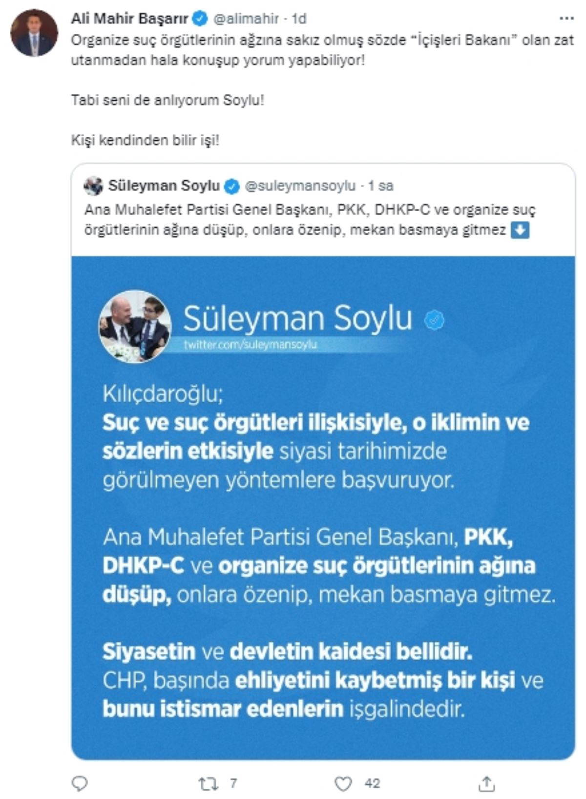 Süleyman Soylu'ya bir tepki de CHP Mersin Milletvekili ve TBMM Anayasa Komisyonu Üyesi Ali Mahir Başarır'dan geldi. Başarır, Twitter hesabı üzerinden yaptıpı paylaşımda Bakan Soylu'ya seslenerek "Organize suç örgütlerinin ağzına sakız olmuş sözde “İçişleri Bakanı” olan zat utanmadan hala konuşup yorum yapabiliyor!Tabi seni de anlıyorum Soylu! Kişi kendinden bilir işi!" ifadelerini kullandı.