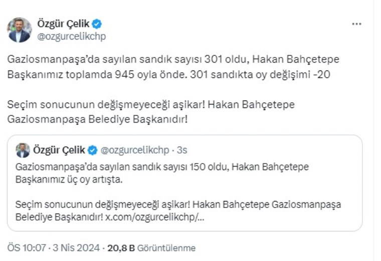 “Gaziosmanpaşa’da sayılan sandık sayısı 301 oldu, Hakan Bahçetepe Başkanımız toplamda 945 oyla önde. 301 sandıkta oy değişimi -20 Seçim sonucunun değişmeyeceği aşikar! Hakan Bahçetepe Gaziosmanpaşa Belediye Başkanıdır!”