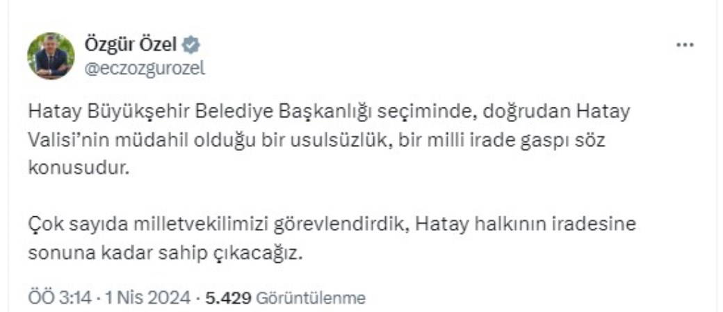 “Hatay Büyükşehir Belediye Başkanlığı seçiminde, doğrudan Hatay Valisi’nin müdahil olduğu bir usulsüzlük, bir milli irade gaspı söz konusudur. Çok sayıda milletvekilimizi görevlendirdik, Hatay halkının iradesine sonuna kadar sahip çıkacağız.”