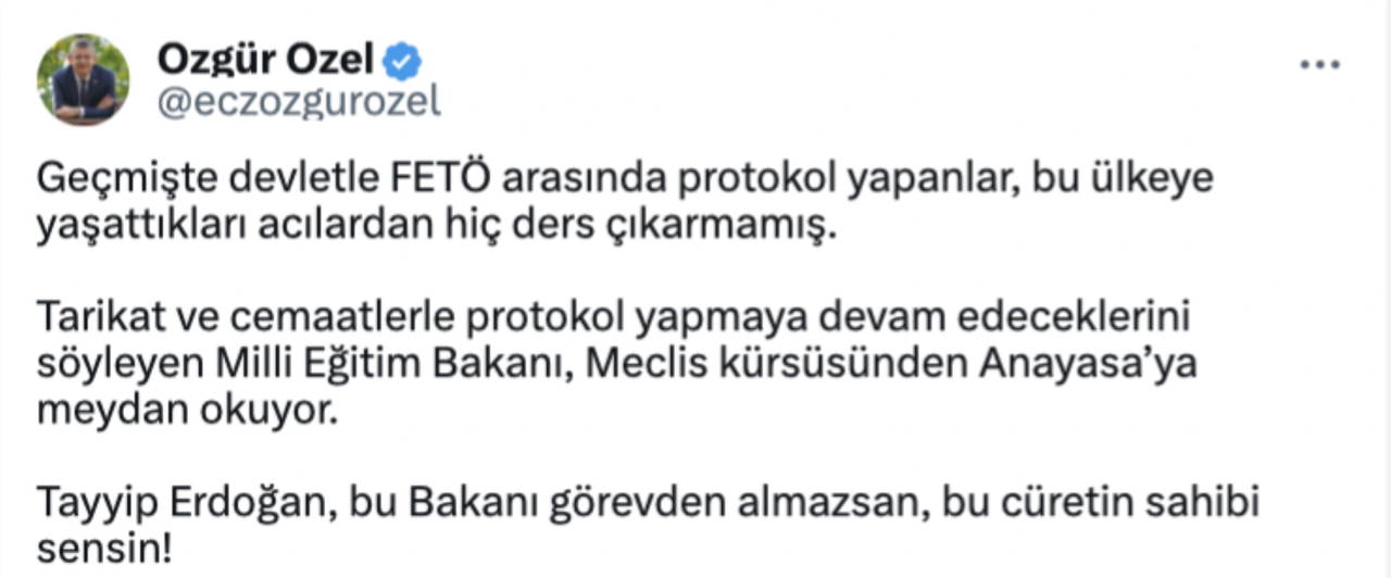 "Geçmişte devletle FETÖ arasında protokol yapanlar, bu ülkeye yaşattıkları acılardan hiç ders çıkarmamış. Tarikat ve cemaatlerle protokol yapmaya devam edeceklerini söyleyen Milli Eğitim Bakanı, Meclis kürsüsünden Anayasa’ya meydan okuyor. Tayyip Erdoğan, bu Bakan'ı görevden almazsan, bu cüretin sahibi sensin!"