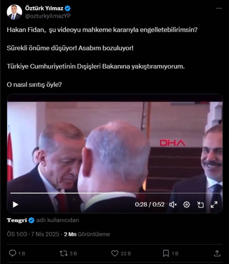 Yenilik Partisi Genel Başkanı Öztürk Yılmaz bu görüntüleri sosyal medya hesabından paylaştı. Fidan'a tepki gösteren Yılmaz, paylaşımına, "Hakan Fidan, şu videoyu mahkeme kararıyla engelletebilir misin? Sürekli önüme düşüyor! Asabım bozuluyor! Türkiye Cumhuriyeti'nin Dışişleri Bakanı'na yakıştıramıyorum. O nasıl sırıtış öyle?" notunu düştü.