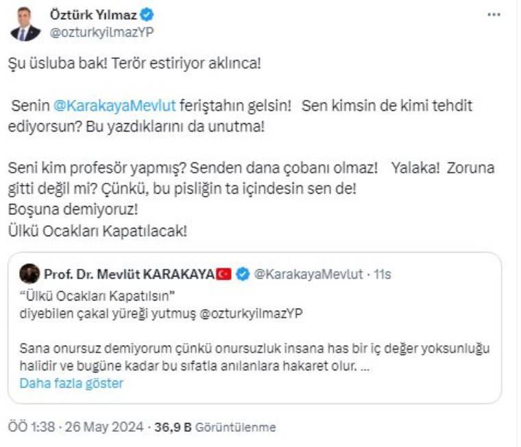 Öztürk bunun üzerine Karakaya'ya sözlerini alıntılayarak bir yanıt verdi. "Şu üsluba bak! Terör estiriyor aklınca!" diyen Yılmaz, Karakaya'ya "Feriştahın gelsin! Sen kimsin de kimi tehdit ediyorsun? Bu yazdıklarını da unutma! Seni kim profesör yapmış? Senden dana çobanı olmaz! Yalaka! Zoruna gitti değil mi? Çünkü, bu pisliğin ta içindesin sen de!" ifadeleriyle seslendi.