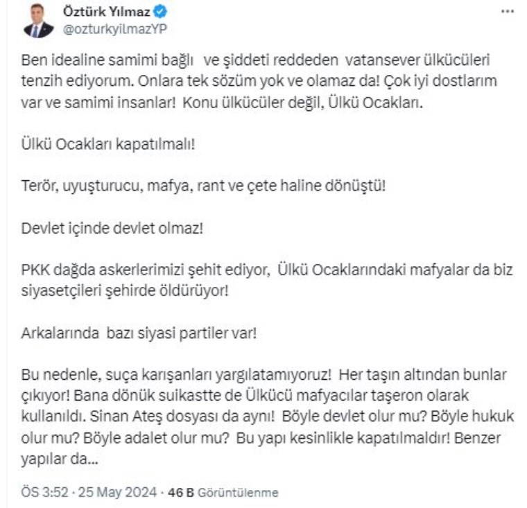 “İdealine samimi bağlı ve şiddeti reddeden vatansever ülkücüleri tenzih ediyorum. Onlara tek sözüm yok ve olamaz da! Çok iyi dostlarım var ve samimi insanlar! Konu ülkücüler değil, Ülkü Ocakları. Ülkü Ocakları kapatılmalı! Terör, uyuşturucu, mafya, rant ve çete haline dönüştü! Devlet içinde devlet olmaz! PKK dağda askerlerimizi şehit ediyor, Ülkü Ocaklarındaki mafyalar da biz siyasetçileri şehirde öldürüyor! Arkalarında bazı siyasi partiler var! Bu nedenle, suça karışanları yargılatamıyoruz! Her taşın altından bunlar çıkıyor! Bana dönük suikastte de Ülkücü mafyacılar taşeron olarak kullanıldı. Sinan Ateş dosyası da aynı! Böyle devlet olur mu? Böyle hukuk olur mu? Böyle adalet olur mu? Bu yapı kesinlikle kapatılmaldır! Benzer yapılar da..."