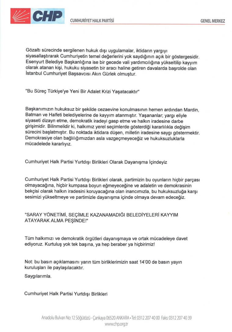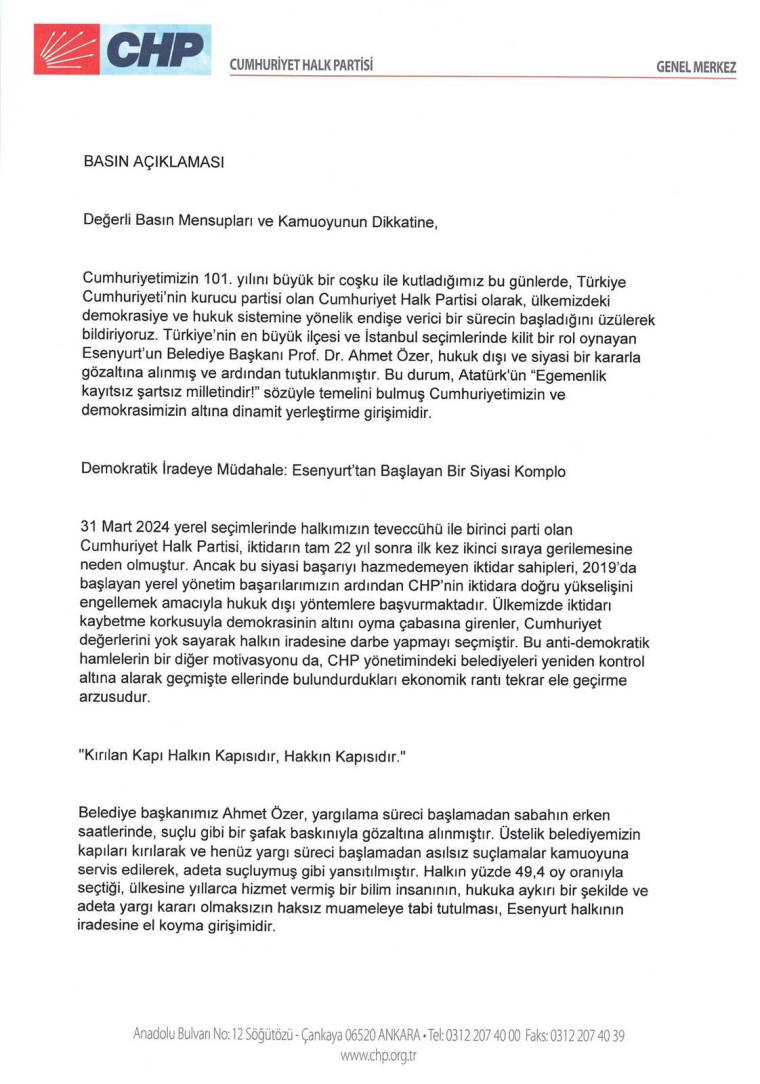 CHP Paris Birliği Başkanı Nazım Ergin, yaptığı basın açıklamasında, "Türkiye’nin en büyük ilçesi olan Esenyurt’un Belediye Başkanı Prof. Dr. Ahmet Özer, siyasi bir kararla gözaltına alınarak tutuklanmıştır. Atatürk’ün 'Egemenlik kayıtsız şartsız milletindir' sözü, cumhuriyet felsefesine oturmuş bir sözdür. Bu kayyum, Cumhuriyetimizin ve demokrasimizin altına dinamit koyma girişimidir" dedi.