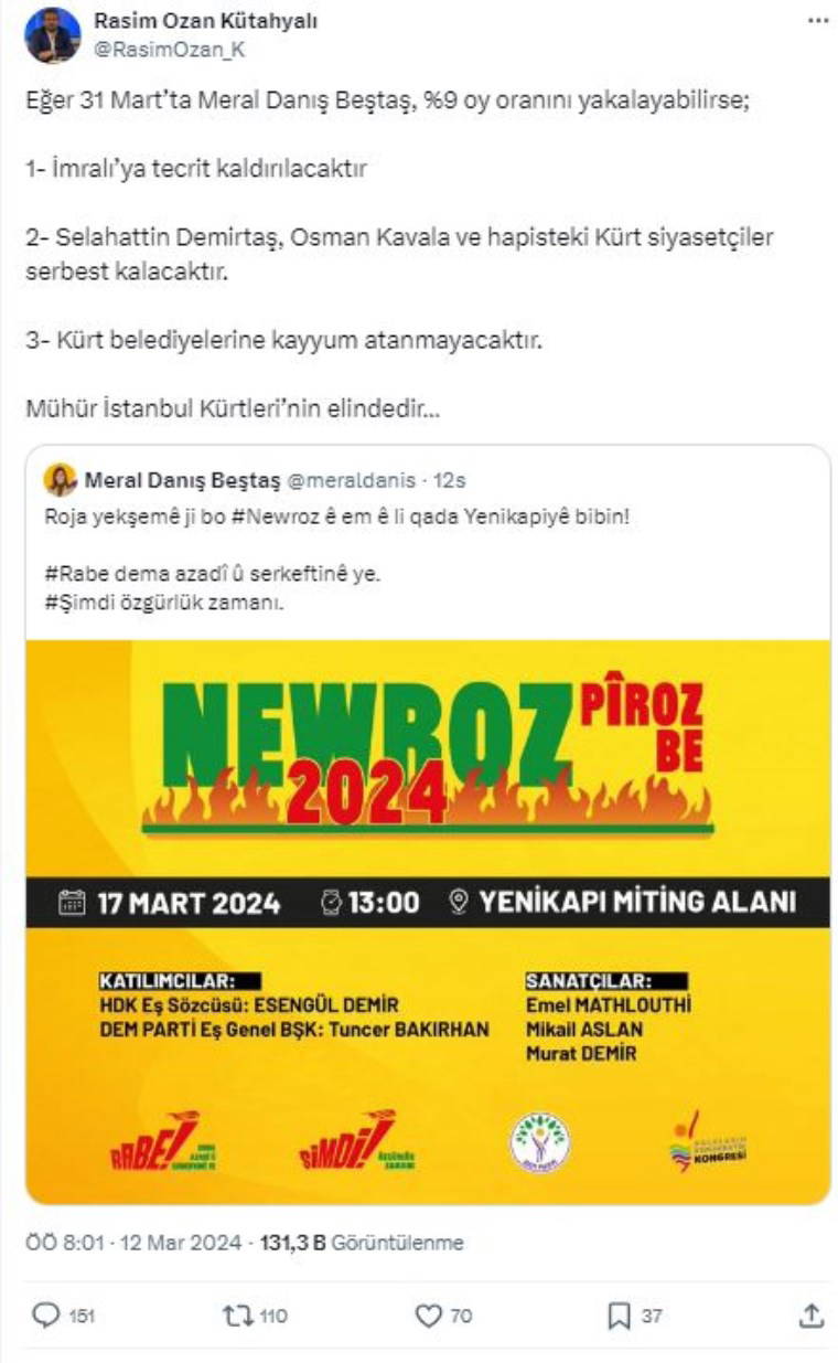 Halkların Demokratik Partisi'nin (DEM Parti) İBB Başkan Adayı Meral Danış Beştaş'ın Nevruz'la ilgili miting davetinde bulunduğu paylaşımı sosyal medya hesabından alıntılayan Kütahyalı, Beştaş'ın oyunun yüzde 9'u bulması halinde gerçekleşeceğini iddia ettiği gelişmeleri sıraladı.