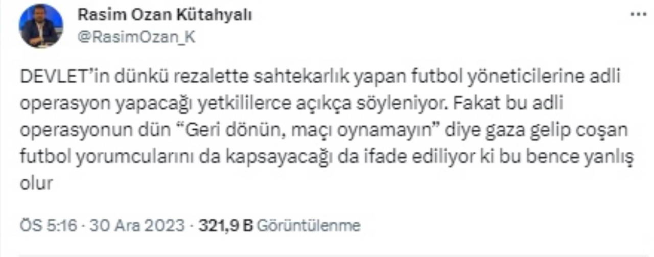 "Devletin dünkü rezalette sahtekarlık yapan futbol yöneticilerine adli operasyon yapacağı yetkililerce açıkça söyleniyor. Fakat bu adli operasyonun dün “Geri dönün, maçı oynamayın” diye gaza gelip coşan futbol yorumcularını da kapsayacağı da ifade ediliyor ki bu bence yanlış olur"