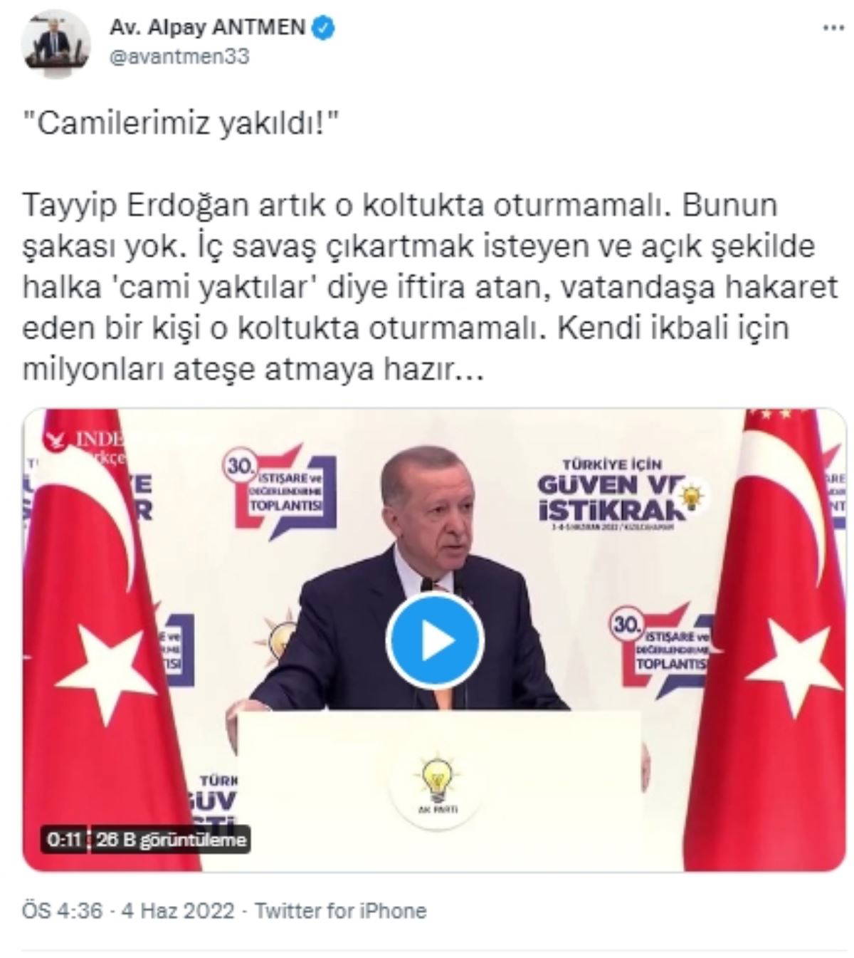 “Tayyip Erdoğan artık o koltukta oturmamalı. Bunun şakası yok. İç savaş çıkartmak isteyen ve açık şekilde halka ‘cami yaktılar’ diye iftira atan, vatandaşa hakaret eden bir kişi o koltukta oturmamalı. Kendi ikbali için milyonları ateşe atmaya hazır…”