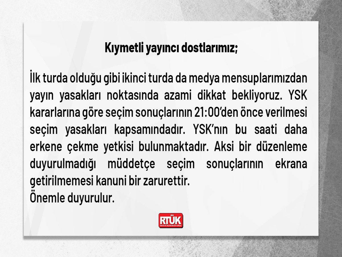 RTÜK Başkanı Ebubekir Şahin, Twitter üzerinden yaptığı paylaşımda medyadan azami dikkat beklediklerini ifade ederken, “Seçim sonuçlarının 21.00’den önce verilmesi yasak kapsamındadır” denildi.