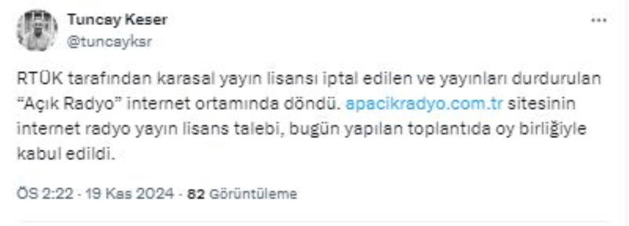 RTÜK üyesi Tuncay Keser, sosyal medya hesabı üzerinden yaptığı paylaşımda; Açık Radyo’nun internet sitesine lisans verildiğini duyurdu.