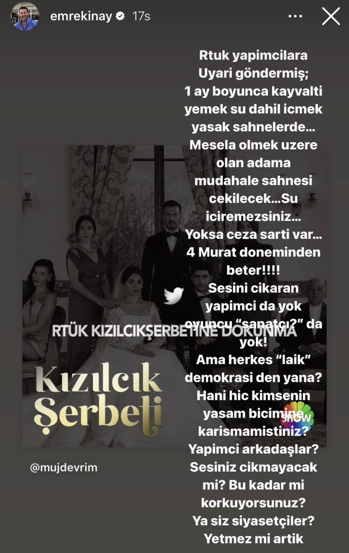 Oyuncu Emre Kınay, Instagram hesabından yaptığı paylaşımda, RTÜK'ün tüm dizi yapımcılarına uyarı gönderdiğini, Ramazan dolayısıyla dizilerde yeme içme sahnelerine yasak getirildiğini öne sürdü.