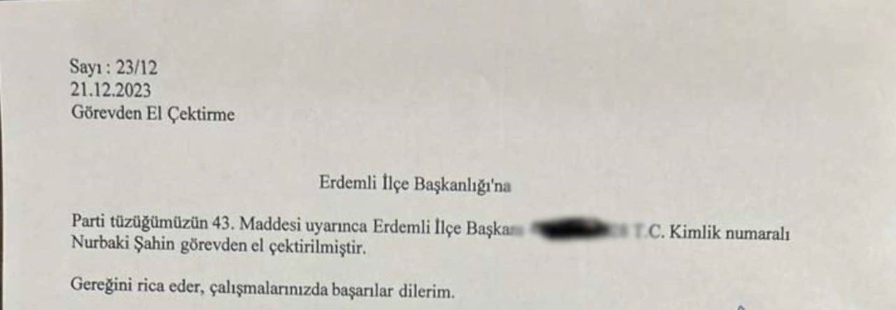Partiden konuyla ilgili yapılan açıklama şöyle: "Görülen lüzum üzerine Erdemli İlçe Başkanımız Nurbaki Şahin ilçe Başkanlığı görevinden alınmıştır."