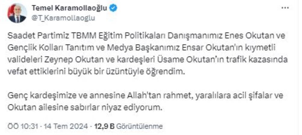 Üç kişinin ölümünü Saadet Partisi Genel Başkanı Temel Karamollaoğlu, sosyal medya platformu X üzerinden yaptığı paylaşımda duyurdu.