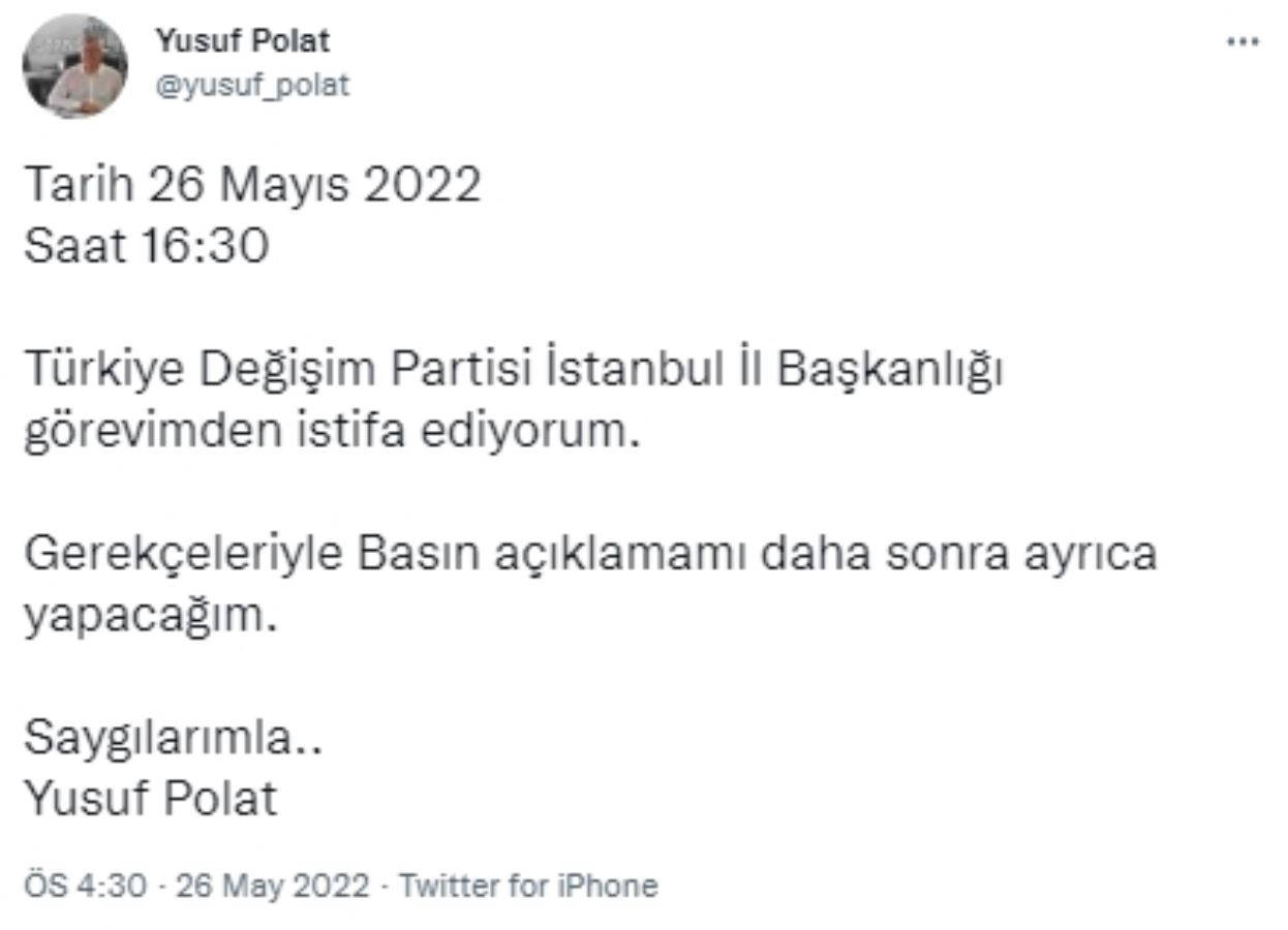 Pola, paylaşımında "Tarih 26 Mayıs 2022. Saat 16:30. Türkiye Değişim Partisi İstanbul İl Başkanlığı görevimden istifa ediyorum. Gerekçeleriyle Basın açıklamamı daha sonra ayrıca yapacağım. Saygılarımla.. Yusuf Polat" ifadelerini kullandı.