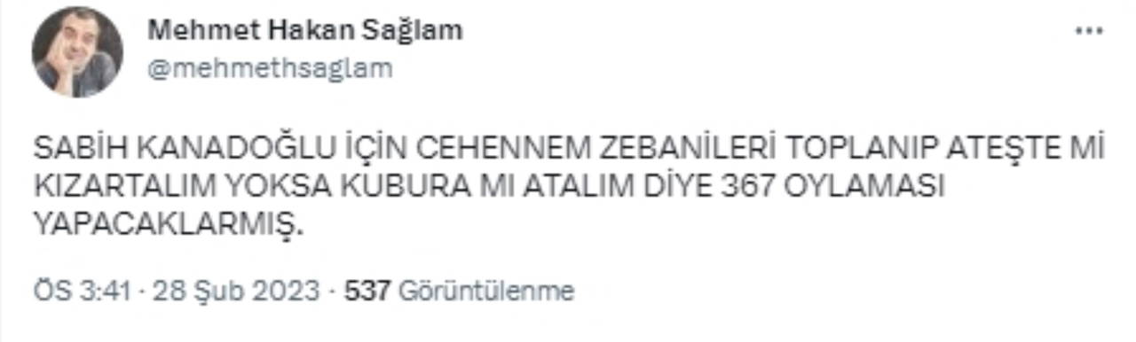 Emekli öğretim üyesi Dr. Mehmet Hakan Sağlam tarafından yapılan o paylaşımda "Sabih Kanadoğlu için cehennem zebanileri toplanıp ateşte mi kızartalım yoksa kubura mı atalım diye 367 oylaması yapacaklarmış" denildi.