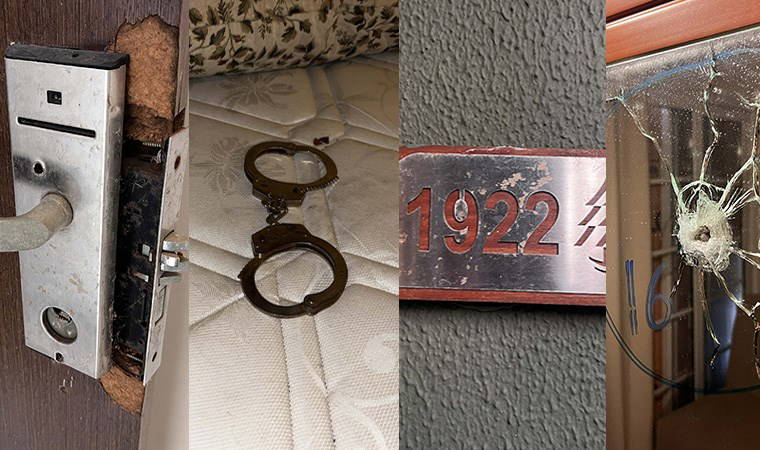 İki odanın pencereleri kırık halde muhafaza edilirken, duvar ile içerideki tüm eşyalarda kurşun izleri görülüyor.