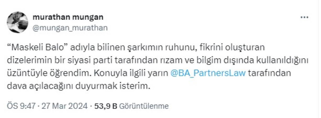 “Maskeli Balo” adıyla bilinen şarkımın ruhunu, fikrini oluşturan dizelerimin bir siyasi parti tarafından rızam ve bilgim dışında kullanıldığını üzüntüyle öğrendim. Konuyla ilgili yarın Bişar Alınak ve Partners tarafından dava açılacağını duyurmak isterim.”