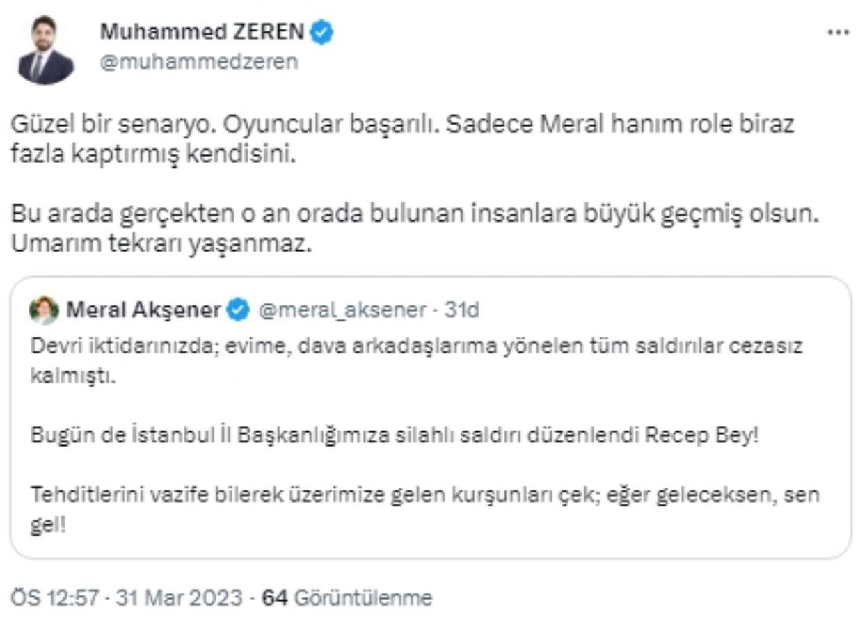 TÜGVA Dış İlişkiler Koordinatörü Muhammed Zeren, İYİ Parti Genel Başkanı Meral Akşener'in saldırı sonrası Twitter hesabından yaptığı paylaşımı alıntılayıp "güzel bir senaryo" dedi.