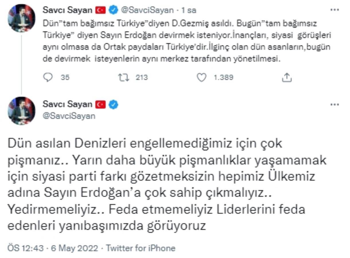 Sayan, "Dün asılan Denizleri engellemediğimiz için çok pişmanız.. Yarın daha büyük pişmanlıklar yaşamamak için siyasi parti farkı gözetmeksizin hepimiz ülkemiz adına Sayın Erdoğan’a çok sahip çıkmalıyız.. Yedirmemeliyiz.. Feda etmemeliyiz. Liderlerini feda edenleri yanıbaşımızda görüyoruz" ifadelerini kullandı.
