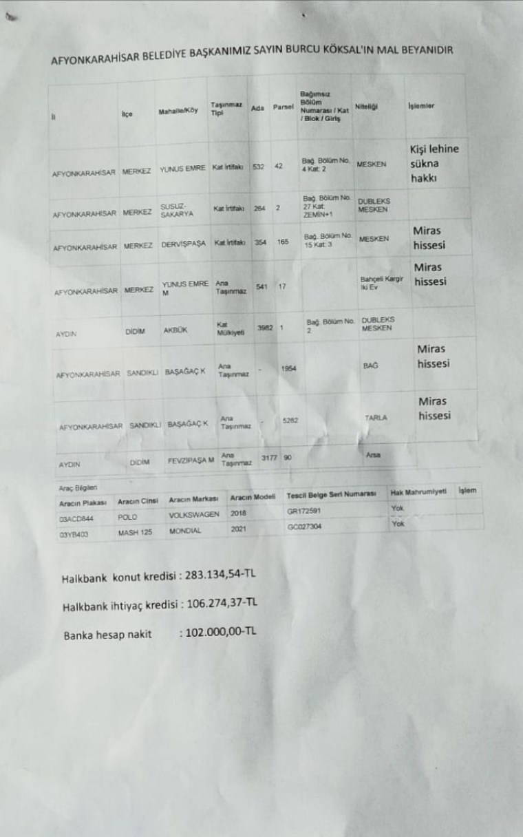 31 Mart yerel seçimleri öncesi CHP Genel Başkanı Özgür Özel Afyonkarahisar’da yaptığı konuşmasında CHP’nin bütün belediye başkanlarının mal varlıklarını belediyelerin girişine asacağını, Burcu Köksal’ın da seçildiğinde mal varlığını belediyenin girişine asacağını söylemişti.