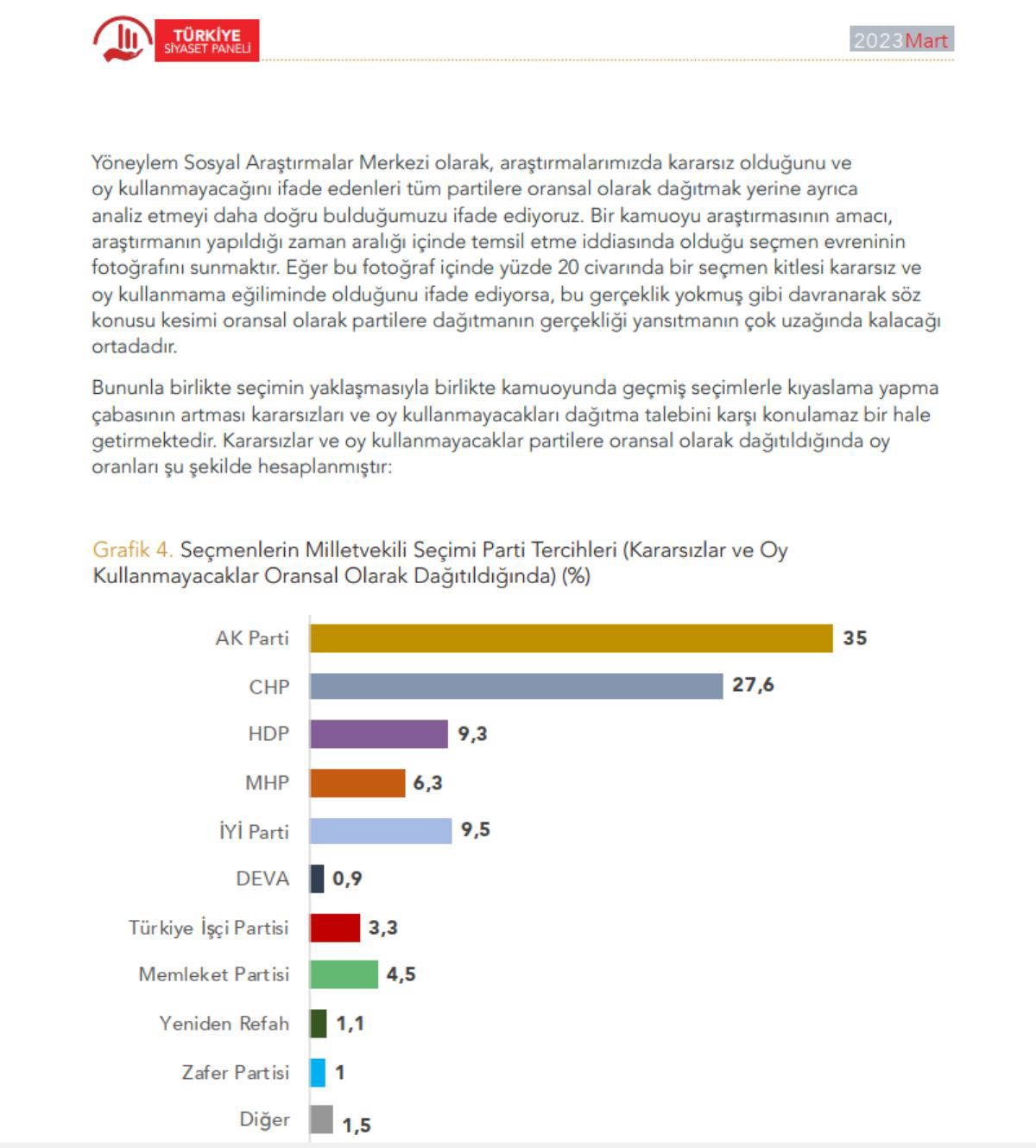 Son olarak Yöneylem Sosyal Araştırmalar Merkezi, 27 – 29 Mart 2023 tarihleri arasında 27 kentte yaptığı son seçim anketinin sonuçlarını paylaştı. 2 bin 655 kişiyle görüşülerek yapılan araştırmada seçmenlere 14 Mayıs Milletvekili Genel Seçimi'ndeki tercihleri soruldu.