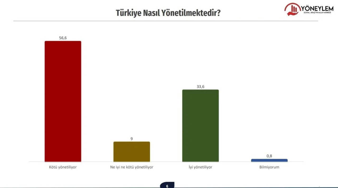 Ankette sorulan 'Türkiye nasıl yönetilmektedir?' sorusuna ise katılımcıların yüzde 56,6'sı 'kötü', yüzde 33,6'sı 'iyi', yüzde 9'u ise 'ne iyi ne kötü' yanıtını verdi.