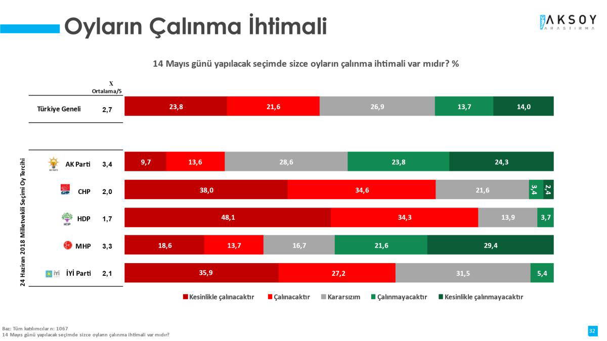 Türkiye genelinde oylar çalınmayacaktır diyenlerin oranı toplamda %27,7’de kalıyor. Üstelik bu oranı oluşturan seçmenin neredeyse tamamı diyebileceğimiz bir oranı AKP ve MHP’ye oy veren seçmenden oluşuyor. Doğrudan çalınacak diyenlerin toplamı CHP seçmeninde %72,6, İYİ Parti seçmeninde %63,1 ve HDP seçmeninde %82,4. Bu oranlara baktığımızda bu konunun muhalefet seçmeni için bir sorun olmaktan çıkıp bir ızdıraba dönüştüğünü söyleyebiliriz. Oyunun çalınacağına inanmış insanlara sandığa git ve iktidarı değiştir diyoruz.