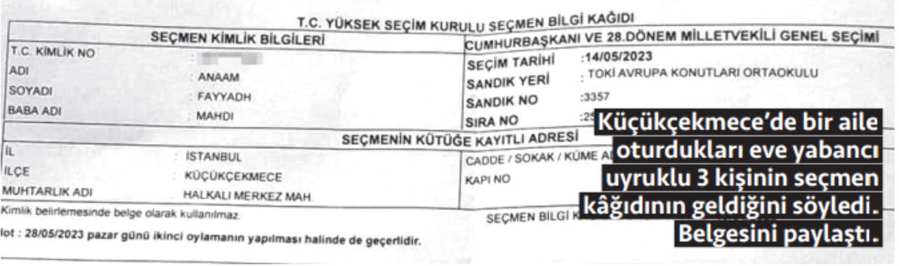 Öte yandan aynı durumun İstanbul Küçükçekmece’de bir apartmanda da görüldüğü ortaya çıktı. Bir aile Küçükçekmece’deki evlerine gelen seçmen kâğıdında oturdukları dairede yabancı uyruklu 3 kişinin olduğunu öğrendi. Yurttaş duruma tepki göstererek “YSK’nin aldığı karar doğrultusunda oy kullanabilecekler” dedi.