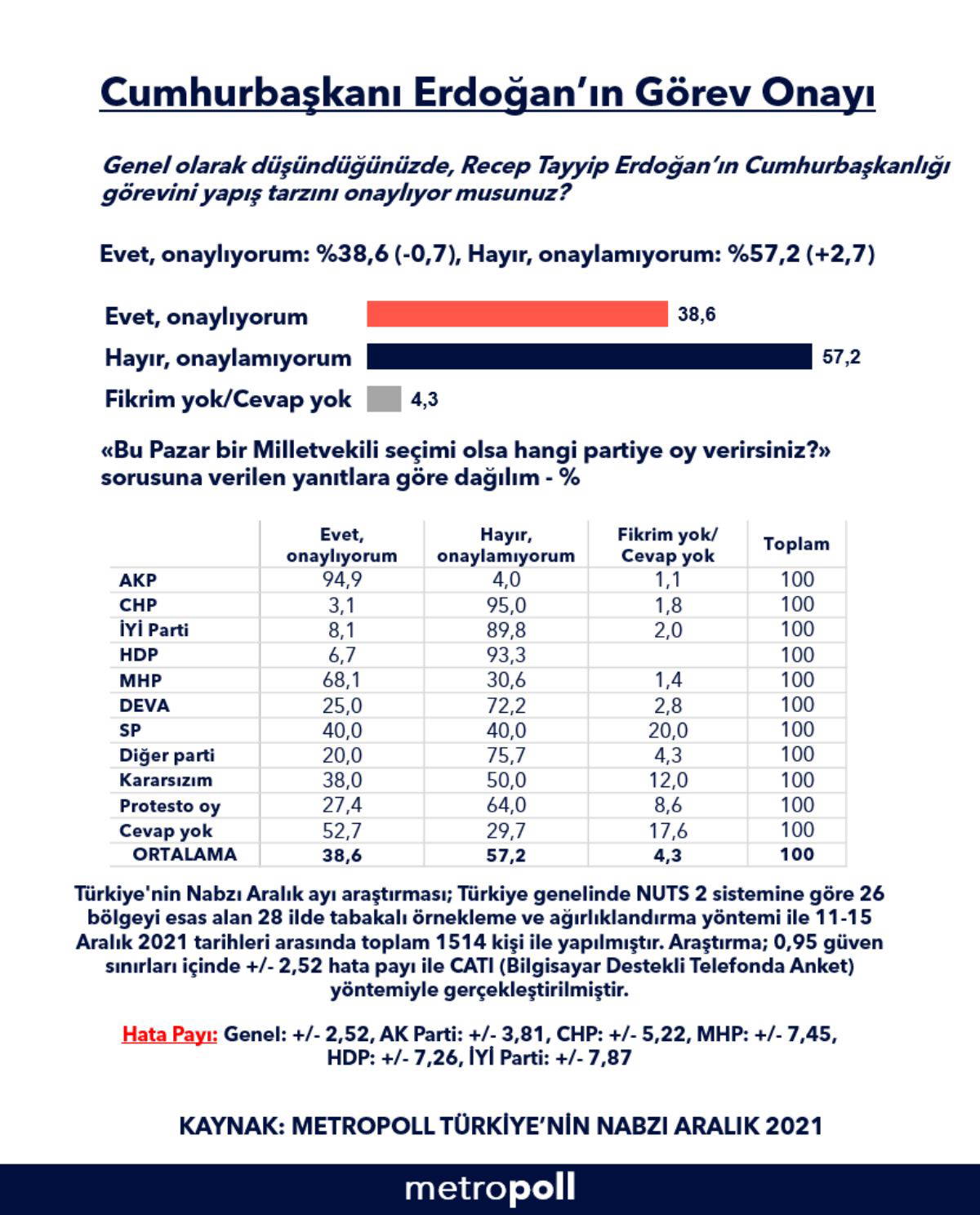 Bununla birlikte MetroPOLL Araştırma, Erdoğan'ın Aralık ayı görev onayına dair dikkat çeken sonucu sosyal medya hesabından paylaştı. Ankette, yurttaşlara "Recep Tayyip Erdoğan'ın Cumhurbaşkanlığı görevini yapış tarzını onaylıyor musunuz" sorusu yöneltildi.