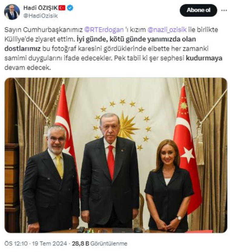 Görüşmenin duyurusu, Özışık'tan geldi. Erdoğan'ı kızı Nazlı Özışık'la birlikte Cumhurbaşkanlığı Sarayı'nda ziyaret eden Hadi Özışık, görüşmenin fotoğrafını X hesabından paylaşıp şöyle yazdı: