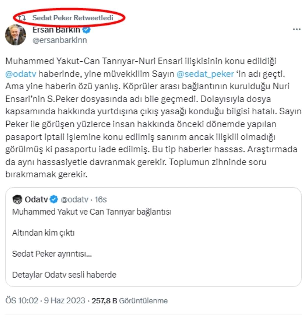 "Muhammed Yakut-Can Tanrıyar-Nuri Ensari ilişkisinin konu edildiği ODATV haberinde, yine müvekkilim Sayın Sedat Peker'in adı geçti. Ama yine haberin özü yanlış.
