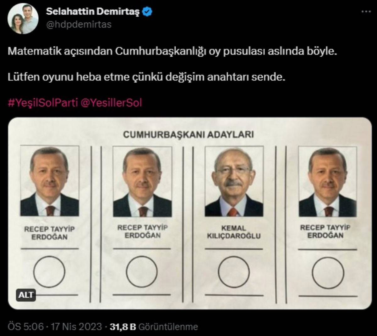 Twitter'dan Kılıçdaroğlu karşısında diğer tüm Cumhurbaşkanı adaylarının Erdoğan olarak resmedildiği bir oy pusulasını paylaşan Demirtaş, "Matematik açısından Cumhurbaşkanlığı oy pusulası aslında böyle. Lütfen oyunu heba etme çünkü değişim anahtarı sende" dedi.