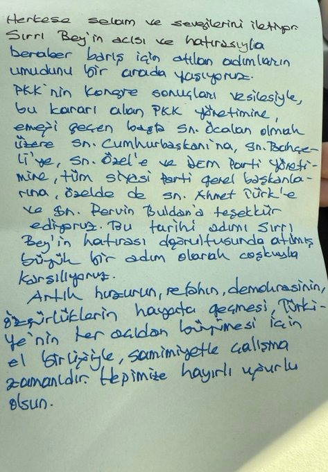 PKK’nin kongre sonuçları vesilesiyle, bu kararı alan PKK yönetimine, emeği geçen başta Sn. Öcalan olmak üzere Sn. Cumhurbaşkanına, Sn. Bahçeli’ye, Sn. Özel’e ve DEM Parti yönetimine, tüm siyasi parti genel başkanlarına, özellikle de Sn. Ahmet Türk’e ve Sn. Pervin Buldan’a teşekkür ediyoruz. Bu tarihi adımı Sırrı Bey’in hatırası doğrultusunda atılmış büyük bir adım olarak coşkuyla karşılıyoruz.