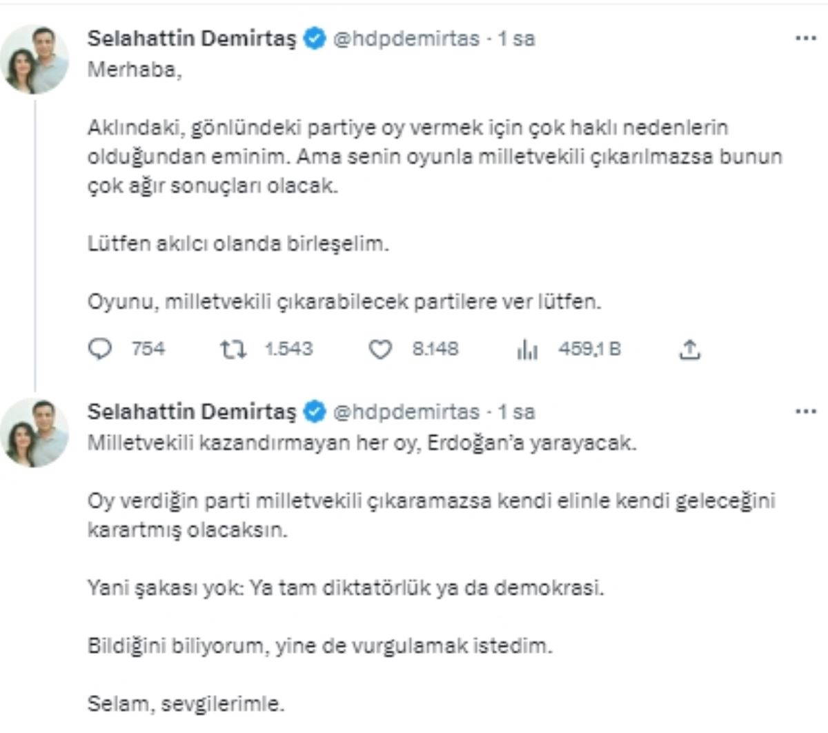 Halkların Demokratik Partisi’nin (HDP) tutuklu eski Eş Genel Başkanı Selahattin Demirtaş, 14 Mayıs'taki seçimleriyle ilgili sosyal medya hesabından avukatları aracılığıyla dikkat çeken bir açıklama yaptı.