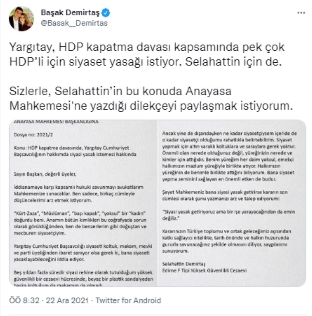 Demirtaş'ın dilekçesini eşi Başak Demirtaş, Twitter hesabından paylaştı. Başak Demirtaş'ın "Yargıtay, HDP kapatma davası kapsamında pek çok HDP’li için siyaset yasağı istiyor. Selahattin için de." diyerek paylaştığı dilekçeye göre, iddianameye karşı kapsamlı hukuki savunmayı avukatlarının sunacağını belirten Demirtaş "Ancak yine de dışarıdayken ne kadar siyasetçiysem içeride de o kadar siyasetçi olduğumu rahatlıkla belirtebilirim. Siyaset yapmak için altın varaklı koltuklara ve saraylara gerek yoktur" dedi.