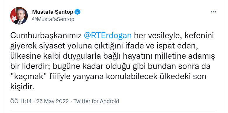 "Cumhurbaşkanımız Recep Tayyip Erdoğan her vesileyle, kefenini giyerek siyaset yoluna çıktığını ifade ve ispat eden, ülkesine kalbi duygularla bağlı hayatını milletine adamış bir liderdir; bugüne kadar olduğu gibi bundan sonra da 'kaçmak' fiiliyle yan yana konulabilecek ülkedeki son kişidir. Seçim kampanyasına malzeme arayanlar, ülkemize katkısı olacak başka konular seçmeli."
