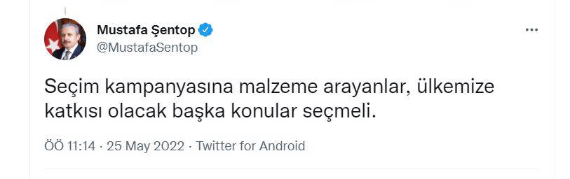 Şentop, "Cumhurbaşkanımız 'kaçmak' fiiliyle yan yana konulabilecek ülkedeki son kişidir. Seçim kampanyasına malzeme arayanlar, ülkemize katkısı olacak başka konular seçmeli" dedi.
