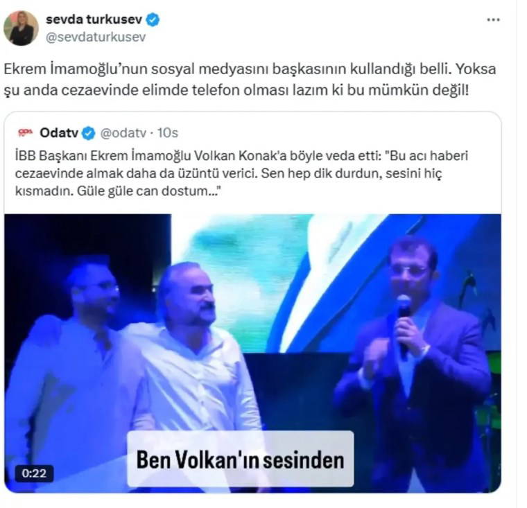 İmamoğlu'nun mesajıyla ilgili bir haberi alıntılayan iktidara yakınlığıyla bilinen yazar Sevda Türküsev, "Ekrem İmamoğlu’nun sosyal medyasını başkasının kullandığı belli. Yoksa şu anda cezaevinde elimde telefon olması lazım ki bu mümkün değil!" ifadelerini kullandı.