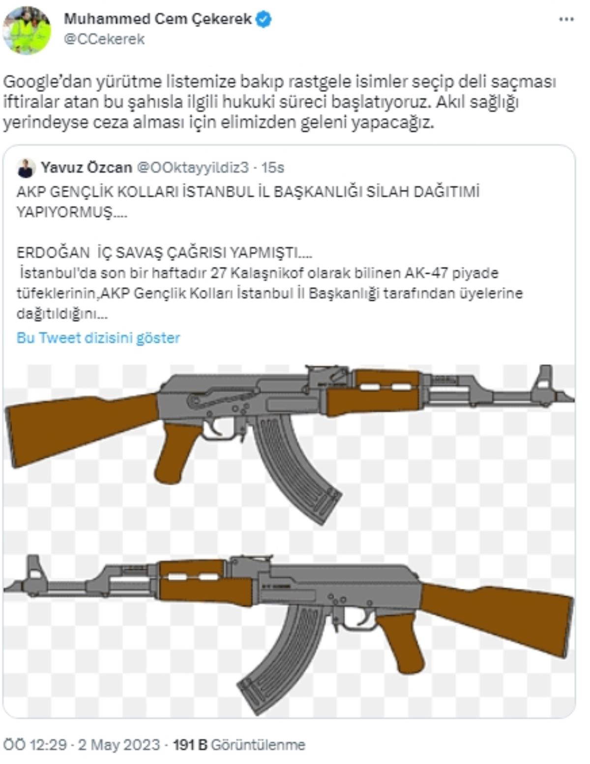 Çekerek, konuya ilişkin sosyal medya hesabından yaptığı paylaşımda, "Google'dan yürütme listemize bakıp rastgele isimler seçip deli saçması iftiralar atan bu şahısla ilgili hukuki süreci başlatıyoruz. Akıl sağlığı yerindeyse ceza alması için elimizden geleni yapacağız" ifadesini kullandı.
