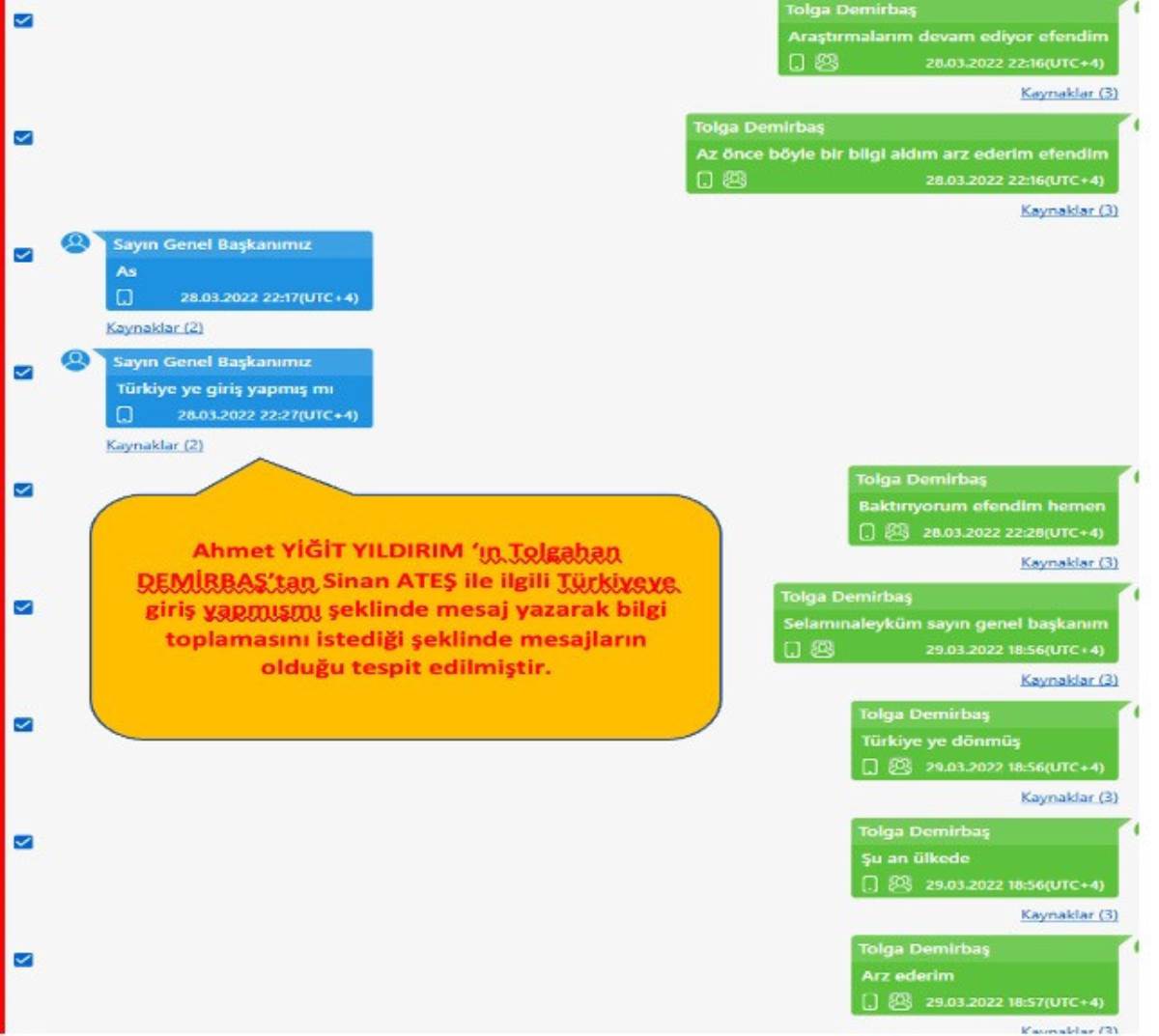 Raporda yer alan yazışmalardan birinde, Demirbaş'ın soruşturma kapsamında tutuklanan cinayet büroda görevli Komiser M.E.A.’ya, 10 Mart 2022’de “Amirim bizim GB (Genel Başkan) istedi de, 0505 …. telefon numarası, adres lazım bize sana zahmet olmazsa” şeklinde mesaj gönderdiği, M.E.A'nın da numarayı sistemden sorguladıktan sonra, Sinan Ateş’i kastederek, “Reis önceki GB’ye çıkıyor bu numara” yanıtını verdiği, Demirbaş’ın “Aynen reis, onun ipini çekmişler” yanıtını verdiği belirtildi.