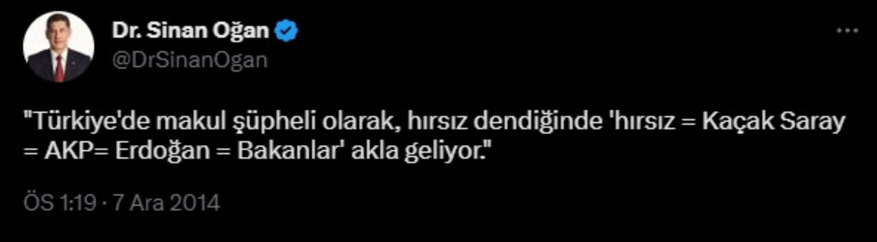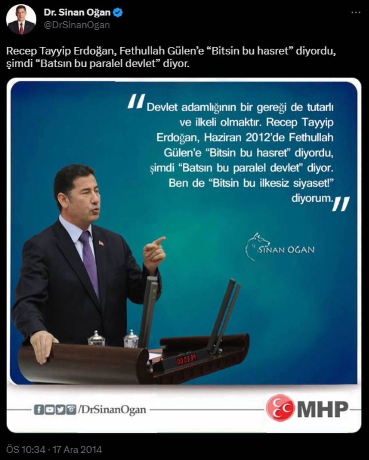 Sinan Oğan, 17 Aralık 2014'te yaptığı bir başka paylaşımda ise, Erdoğan'ın Gülen ile olan bağını anımsatarak "Recep Tayyip Erdoğan, Fethullah Gülen’e 'Bitsin bu hasret' diyordu, şimdi 'Batsın bu paralel devlet' diyor" ifadelerine yer vermişti.