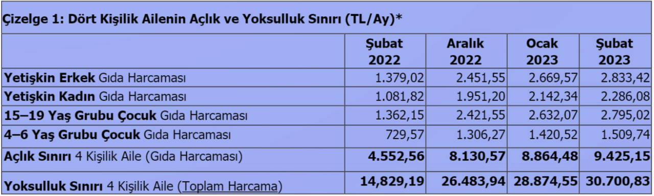 Türk-İş verilerine göre, Şubat 2023'te açlık sınırı 9 bin 425,15 liraya, yoksulluk sınırı 30 bin 700,83 liraya yükselmişti.
