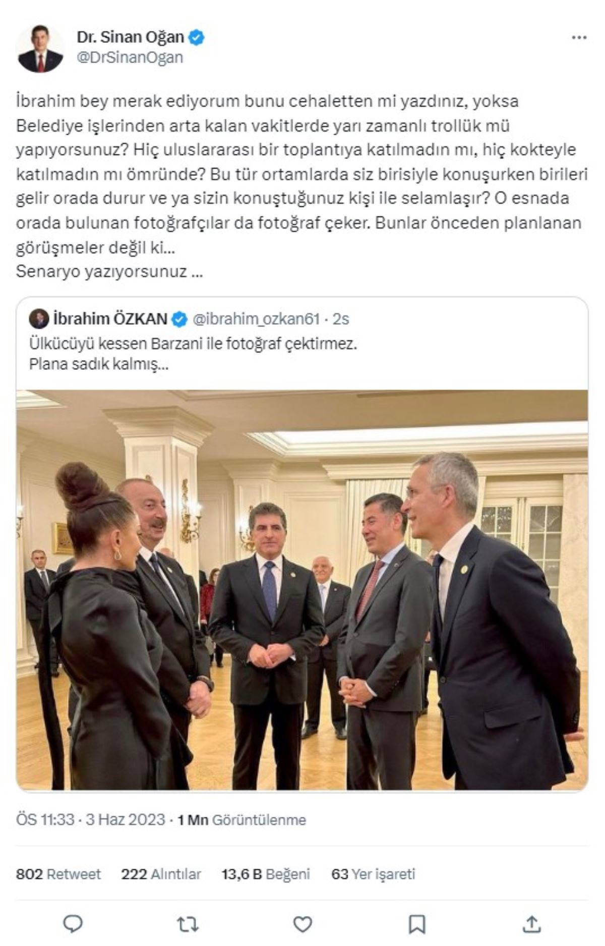 “İbrahim bey merak ediyorum bunu cehaletten mi yazdınız, yoksa belediye işlerinden arta kalan vakitlerde yarı zamanlı trollük mü yapıyorsunuz? Hiç uluslararası bir toplantıya katılmadın mı, hiç kokteyle katılmadın mı ömründe? Bu tür ortamlarda siz birisiyle konuşurken birileri gelir orada durur ve ya sizin konuştuğunuz kişi ile selamlaşır? O esnada orada bulunan fotoğrafçılar da fotoğraf çeker. Bunlar önceden planlanan görüşmeler değil ki… Senaryo yazıyorsunuz..."