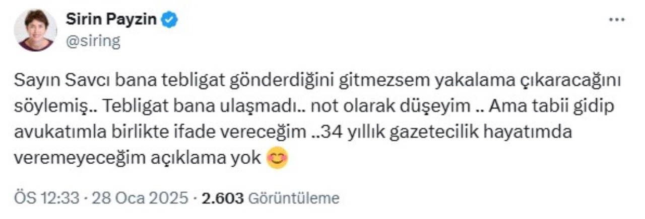 Payzın, konuyla ilgili bir sonraki paylaşımında "Sayın savcı bana tebligat gönderdiğini, gitmezsem yakalama çıkaracağını söylemiş. Tebligat bana ulaşmadı. Not olarak düşeyim. Ama tabii gidip avukatımla birlikte ifade vereceğim. 34 yıllık gazetecilik hayatımda veremeyeceğim açıklama yok" açıklaması yaptı.