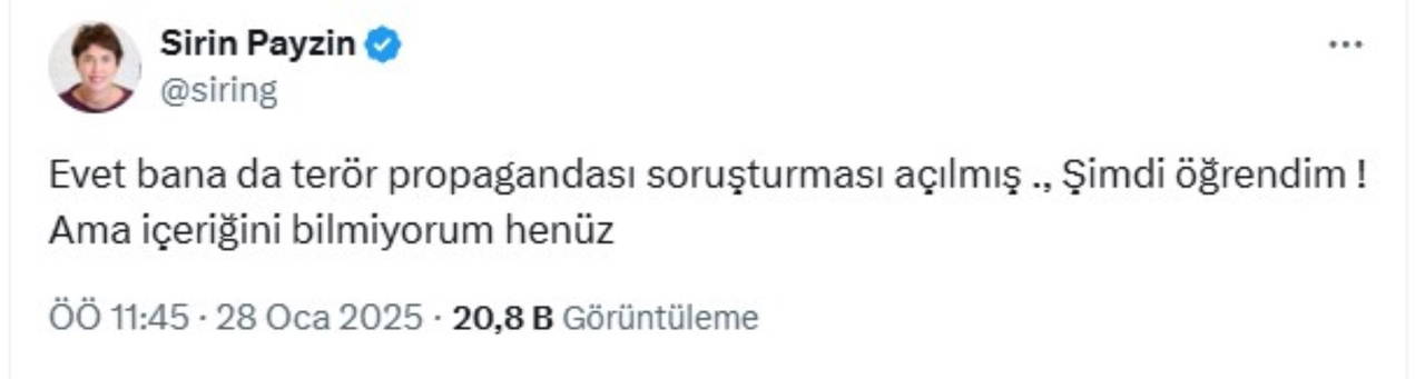 Gazeteci Şirin Payzın, sosyal medya hesabından yaptığı açıklamada, kendisi hakkında "terör propagandası" gerekçesiyle soruşturma başlatıldığını duyurdu.