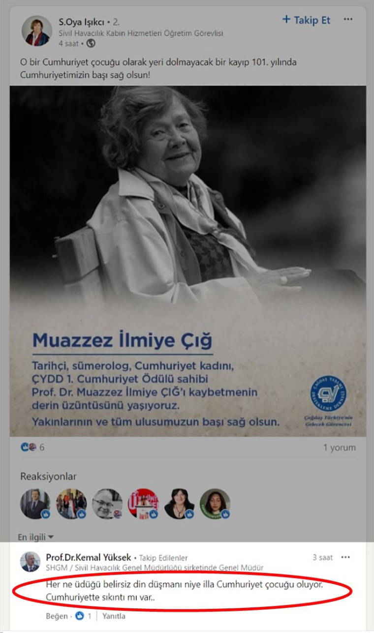 Sivil Havacılık Kabin Hizmetleri Öğretim Görevlisi S.Oya Işıkcı'nın "O bir Cumhuriyet çocuğu olarak yeri dolmayacak bir kayıp 101. yılında Cumhuriyetimizin başı sağ olsun!" paylaşımının altına Kemal Yüksek, “Her ne üdüğü belirsiz din düşmanı illa neden Cumhuriyet Çocuğu Oluyor. Cumhuriyette sıkıntı mı var..” yorumunu yaptı.