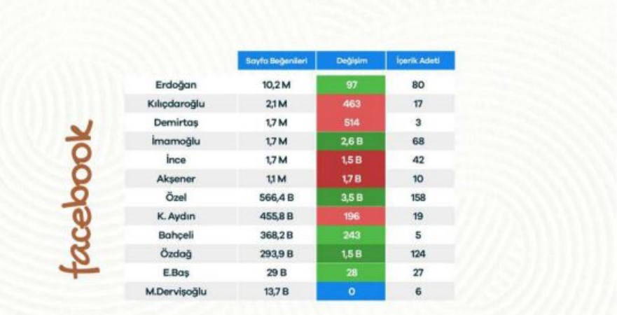 Instagram'a gore çok daha eski bir sosyal medya platformu olan Facebook'ta da liderlerin sayfalarını beğenenler sıralamasında AKP'li Cumhurbaşkanı Recep Tayyip Erdoğan birinciliği açık arayla önde bulunduruyor. Rapora göre, Facebook'ta beğeni sayısı 10.2 milyon olan AKP'li Cumhurbaşkanı, temmuz ayında 80 içerik paylaştı. Erdoğan'ın sayfasını takip eden isim ise 2.1 milyon beğeni sayısıyla CHP'nin önceki dönem genel başkanı Kemal Kılıçdaroğlu oldu. Aynı sıralamada İBB Başkanı Ekrem İmamoğlu önceki dönem HDP Eş Genel Başkanı Selahattin Demirtaş'la üçüncülüğü paylaştı. İki ismin sayfasının da 1.7 milyon beğeni sayısı bulunuyor.
