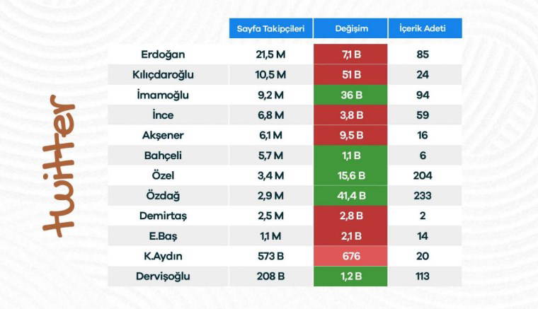 Erdoğan'ın açık ara önde olduğu tablo, sosyal medya platformu X'te de değişmiyor. Buna göre Erdoğan'ın X'te 21.5 milyon takipçisi var. Temmuz ayında 85 paylaşımda bulunan Erdoğan, bu ayda 7100 takipçi kaybetmiş. AKP'li Cumhurbaşkanın ardından gelen ve 10.5 milyon takipçisi olan önceki dönem CHP Genel Başkanı Kemal Kılıçdaroğlu'nun temmuz ayında 51 bin takipçi kaybettiği görülüyor. 9.2 milyon takipçisi olan İBB Başkanı Ekrem İmamoğlu ise bu dönemde 36 bin takipçi kazandı.
