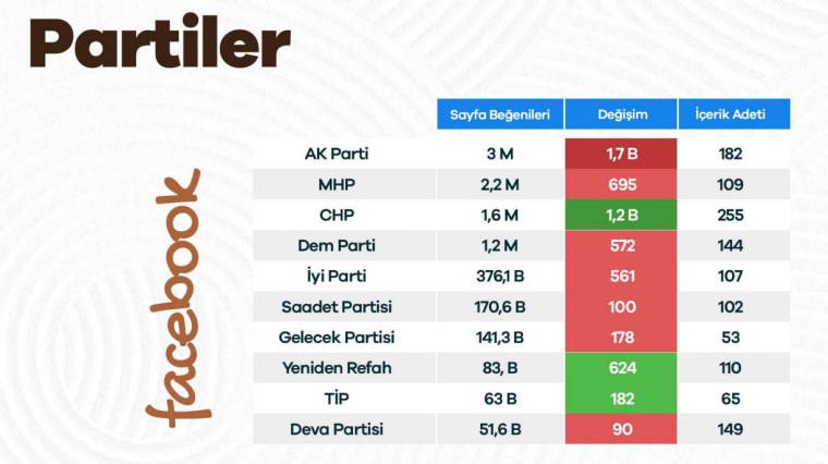 Rapora göre, siyasi partiler arasındaki sosyal medya performansını gösteren tablo daha ilginç bir hal alıyor. Buna göre, Facebook'ta iktidar partisi AKP 3 milyon beğeni sayısıyla ilk sırada. İktidarın Cumhur İttifakı'ndaki ortağı MHP de 2.2 milyon beğeni sayısına sahip. Facebook'u aktif olarak kullanan iki parti de temmuz ayında sırasıyla 182 ve 109 içerik paylaşmış. CHP ise beğeni sıralamasında 1.6 milyon beğeni sayısıyla 3'üncü sırayı alırken 255 içerikle zirvede bulunuyor.