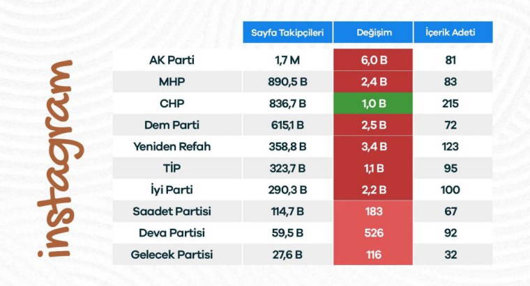 İktidar partisi AKP'nin, "yasaklı" Instagram'da 1.7 milyon takipçisi bulunuyor. 81 içerik paylaşan AKP'yi 890 bin takipçiyle ittifak ortağı MHP izliyor. 836 bin takipçisi olan CHP ise Facebook'ta olduğu gibi bu platfromda da 215 içerikle en aktif kullanan siyasi parti durumunda.